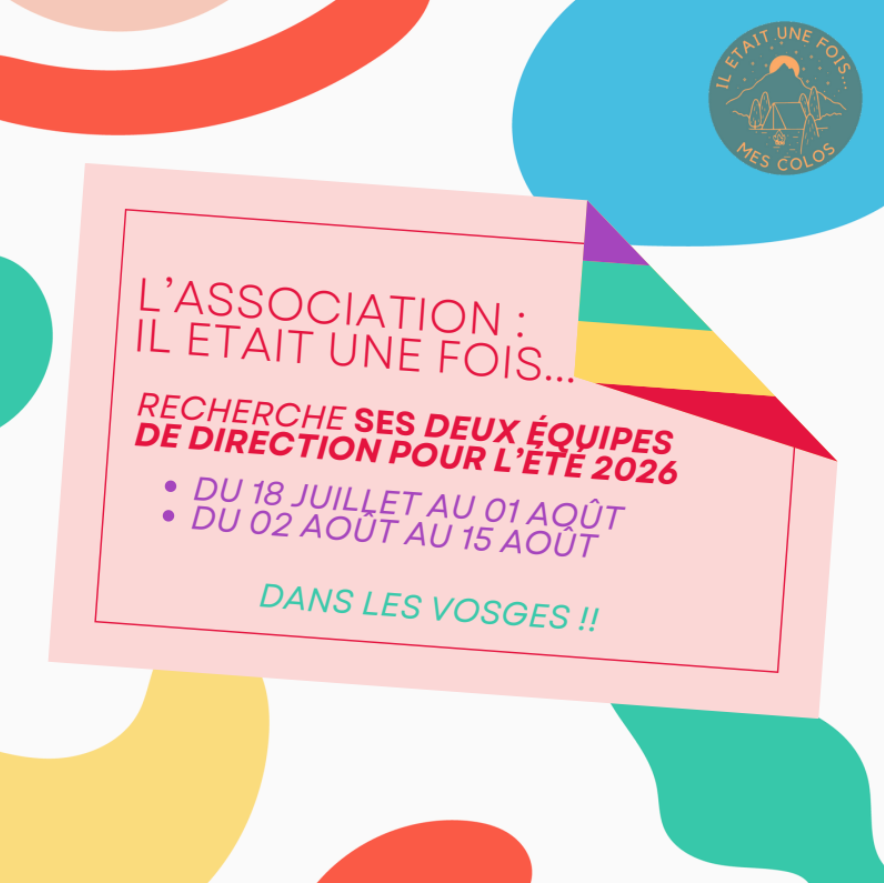 L’association Il Était Une Fois… recherche actuellement ses deux équipes de direction du 18 juillet au 01 août ou du 02 août au 15 août à Saulxures-sur-Moselotte (Vosges). Chaque session rassemble 69 enfants (de 6 à 17 ans répartis en 3 tranches d’âge avec chacune ses thématiques) pour 22 adultes.
